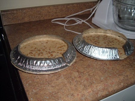 Pie crust shield note: You'll see here on the pictures that I had two shields put on the edges of the crusts to keep them from browning. Mine are homemade. Cut out the edges of two previous pie tins and there you go!